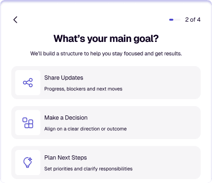 Keep your team focused with structured check-ins. Smart Agendas help surface blockers, prioritize actions, and drive decisions. So, every meeting leads to outcomes, not just updates.