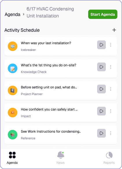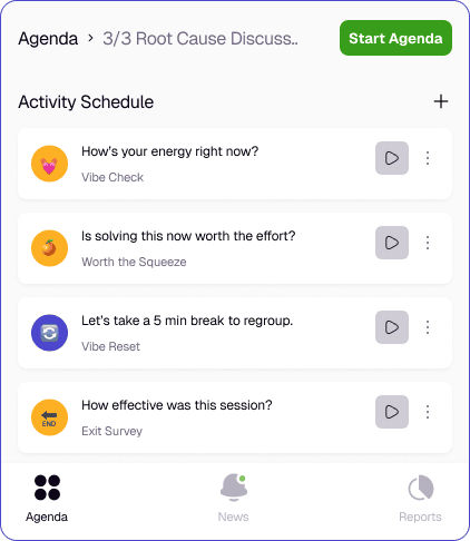 Share your meeting goals, audience, and scope—we’ll handle the rest. Each agenda is tailored to your needs and packed with interactive activities that keep attention high and conversations focused. Need to adjust mid-meeting? Just hit play, see who’s engaged, and keep things moving without forcing participation.